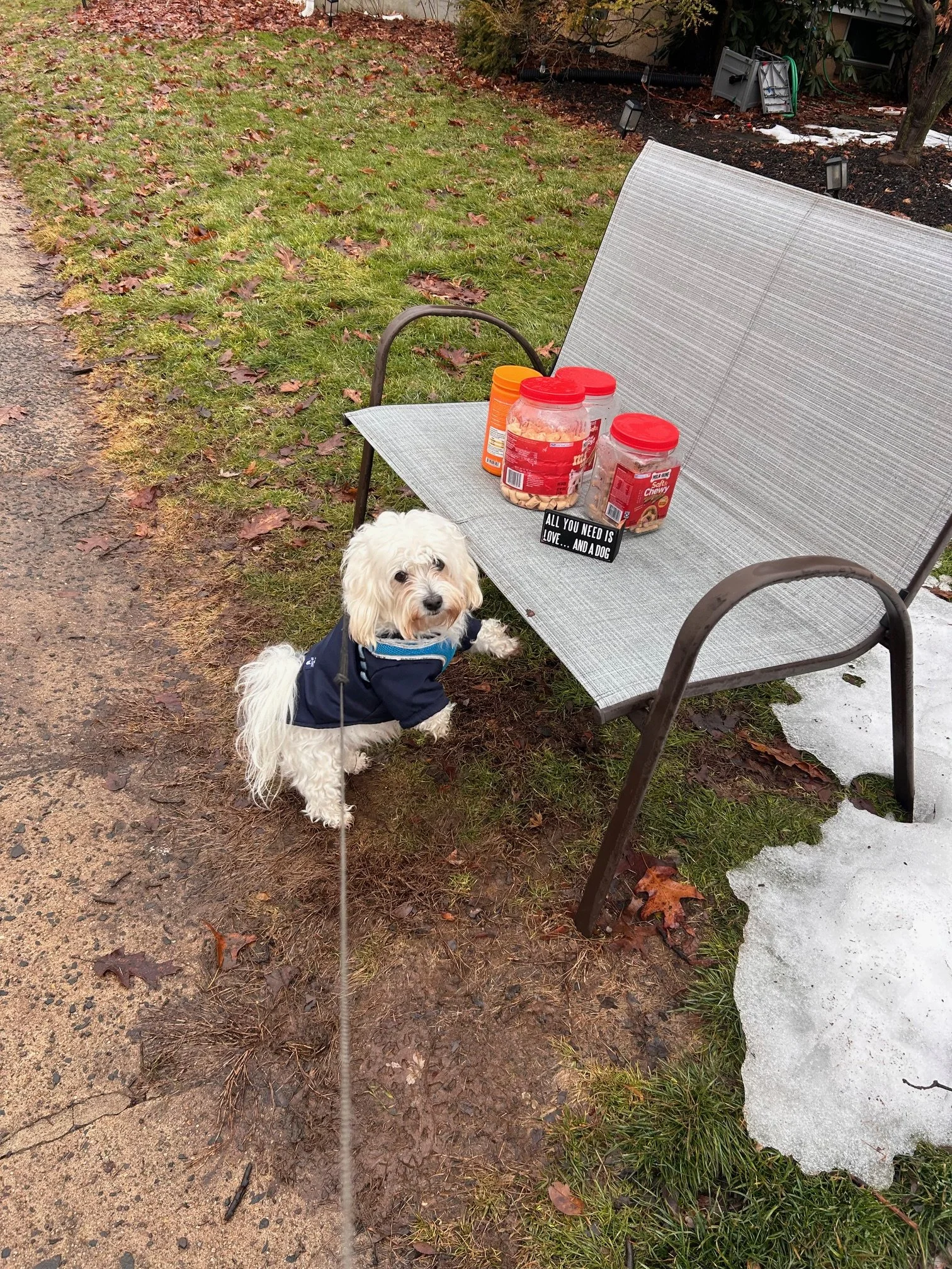 Neighbor has bench at sidewalk where people contribute dog treats. It has become a part of every walk for some.