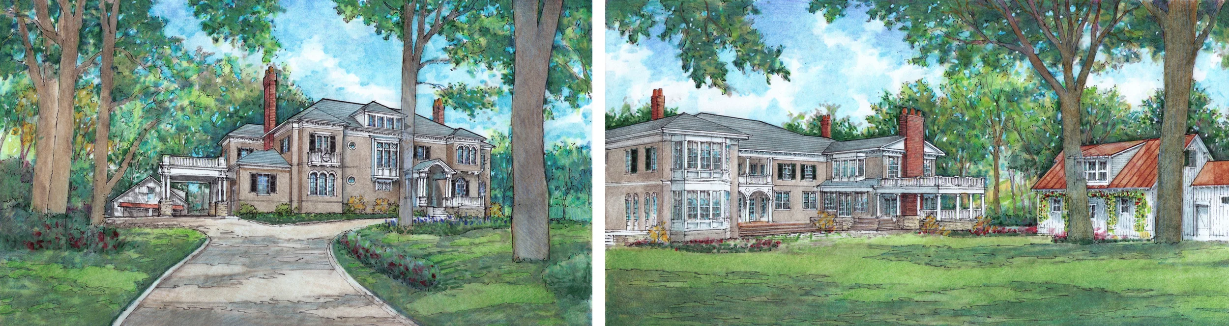 Renderings of new front (with porte-cochere) and back of house, created for variance submittal