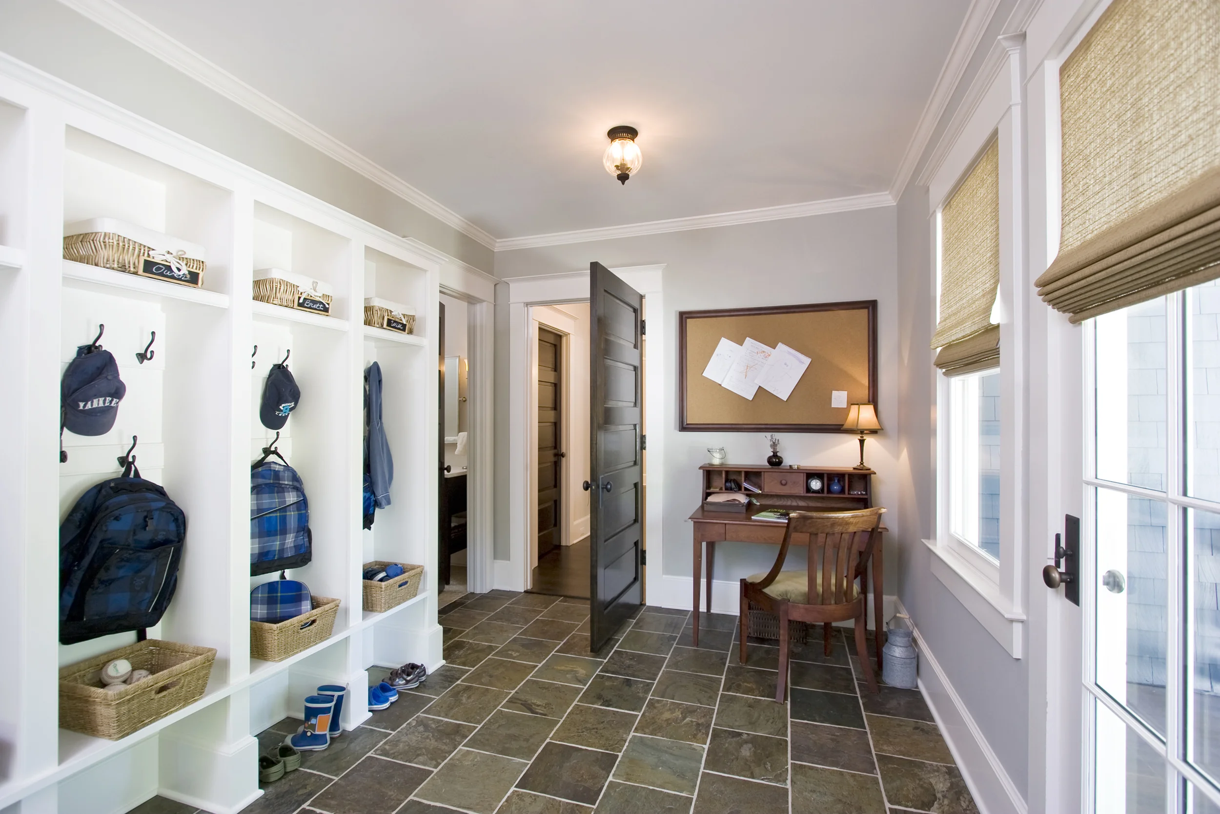 Mud room: a must-have space to keep this family of six organized! It also has a gracious powder room too. Two large storage closets for off-season coats and boots. Desk and bulletin board keep everyone organized.