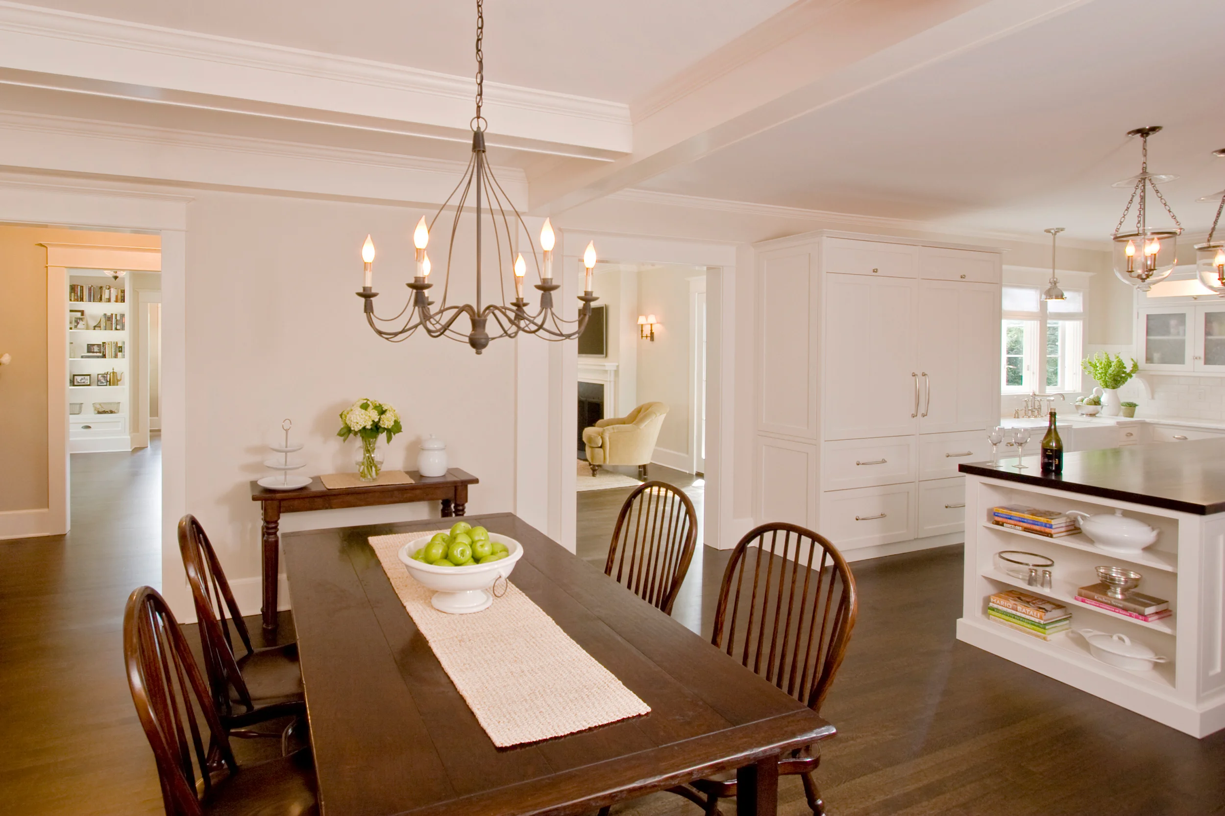 The view from the kitchen island towards the kitchen table now offers the homeowner commanding visual access to the entry hall, dining room, and family room/library as well as the side mud room entrance. The new eat-in area with custom-designed fireplace was formerly the kitchen workspace and offers a cozy setting in front of the fire. One can now easily circulate thru a wet bar area to the library and study or family room.
