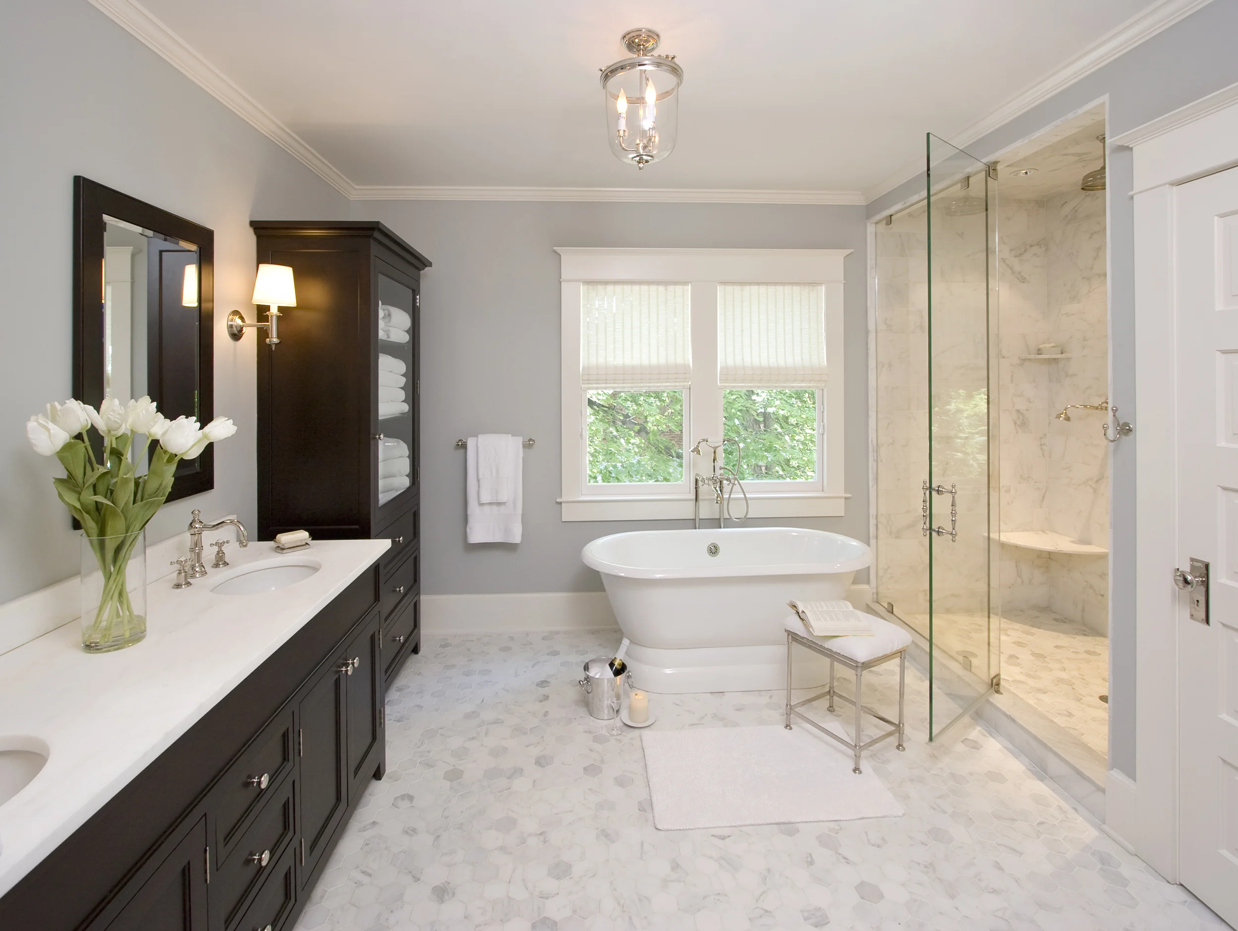 Primary Suite Bathroom is a Houzz.com favorite with over 120K saves and everyone asking what color is that on the wall!
